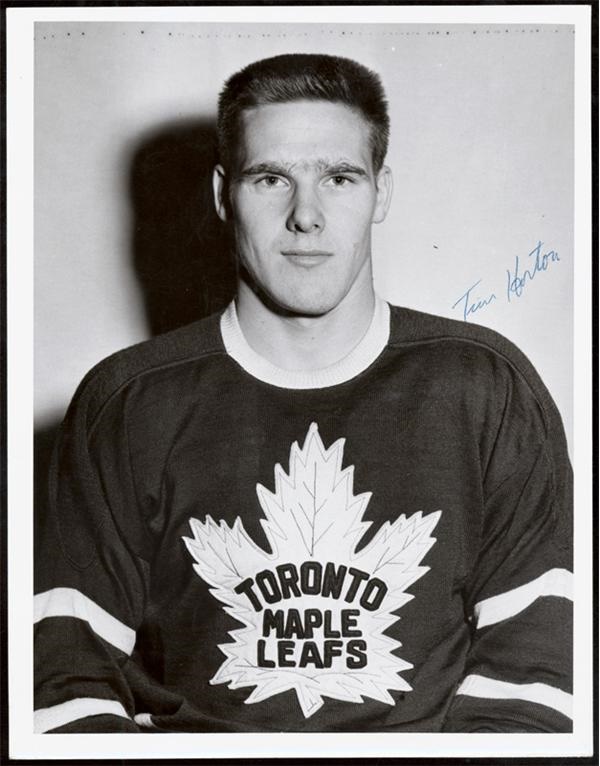 Nat and Lou Turofsky spent three decades photographing the NHL's Original six teams, creating a visual history of the league that captured more than simply game action but the essence of the men who played it. This shot of ill-fated Maple Leaf defenseman Tim Horton, for example, reveals a rock-jawed, cocky guy with a buzzcut and eyebrows merging over the bridge of his nose. On back is the Turofsky studio stamp and typed biographical tidbits of Horton. 6.5 x 8.5" and NRMT with dotting on top from the original negative.