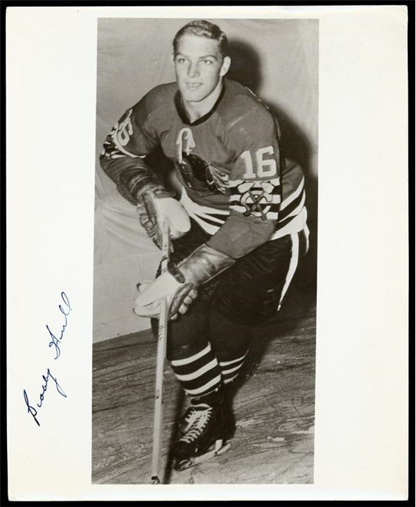 Perhaps the finest and earliest known Hull signed photo, dated on the back February 18, 1956 in blue ink that matches the ink of the signature, thus likely signed on that date. Which would explain why Hull wears a No. 16 in the picture, not his famous 9. At the time he was still in the minors, not to be called up until the 1957-58 season. Signature, then, is amazingly rare, and grades a high 8/10. Image of the youthful looking Hull, showing that even as a 17-year-old kid he was built like a boulder, is 4 1/2 x 9" and set into an overall 8 x 10 that is in EX condition with light damage along the edges, fold markings on the corners and a few creases here and there.