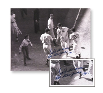 The Kid crosses the plate during the 1941 All-Star game, where he gets a congratulatory handshake from the other man who made batting history this year, arch-nemesis Joe DiMaggio. Blue sharpie signature from Williams is tagged with the phrase, "All Star Game 1941." Number "9" holographic authenticating sticker at bottom right. Professionally matted and framed. COA.