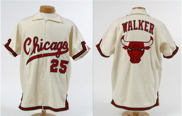 The back of this classic Bulls warm-up jacket reads "Walker," but it might as well be "Underrated" since that's the name Chet "The Jet" Walker lived with for 13 pro seasons. The hard-nosed 6'7" power forward was on the "best ever" '67 Sixers with Wilt Chamberlain before moving to the Bulls, who with Bob Love and Jerry Sloan became one of the toughest clubs in the league, making the playoffs 6 straight years. In all, Walker scored over 18,000 points and was an All-Star 7 times. Today he's a respected Hollywood producer. The white snap-on jacket reads "Chicago" and "25" on the front and "Walker" in red on black tackle twill on verso over a large and scary-looking part-nylon Bulls logo with white stitched horns. Wilson [size] L tagging in neck. Nice use includes some soiling on inside of back collar. Great pre-Jordan Bulls memorabilia. Came from Chicago area sportswriter.