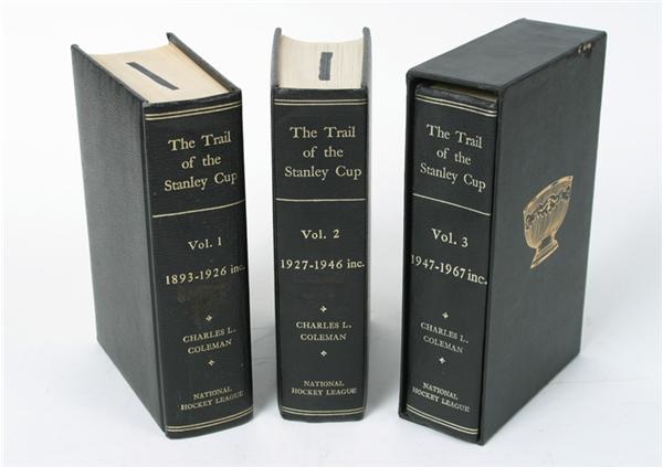 The 3-volume "Trail of the Stanley Cup," is the most exhaustive history of the NHL through 1967. Written by Charles L. Coleman and published by the league in '66, '69 and '76, each book has over 800 pages crammed with summaries, standings, game stories, photos and illustrations by the author. Vol. 1 covers 1893-1926, Vol. 2 1927-46, Vol. 3 1947-67. This magnificent presentation set has an elegant engraved Stanley Cup in gold on each black leather cover, and Vol. 3 is encased in a black box/sleeve. All volumes EX-NRMT with flawless inside pages and damage only on the box. Also a signed letter from the author to a reader expressing doubts about doing a Vol. 4, understandable given the incredible work he put into the trilogy.
