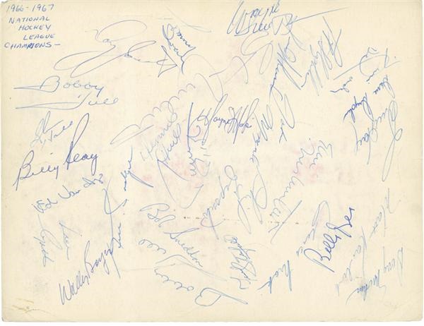 Marvelous signed team photo of the 1966-67 Blackhawks in their fiery red uniforms. Hawks had best record in the NHL that year only to drop a gut-wrenching playoff series to Toronto. Three of the five 'Hawks whose numbers are retired are here: Bobby Hull, Glenn Hall and Stan Mikita, as well as pre-Bruin Phil Esposito and Ken Hodge, Dennis Hull, Chico Maki, Pat Stapleton, Lou Angotti, Fred Stanfield, coach Billy Reay, GM Tommy Ivan, Chairman Arthur Wirtz, etc. VG-NRMT signatures mottle the back of the picture in blue ink, with Hull's one of the best. Photo also VG with mild corner and border damage.
