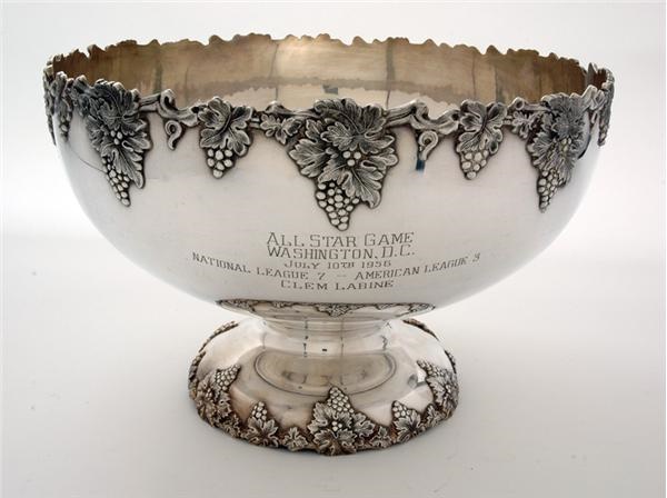Stunning, silver plate bowl with carved grapes flowing over the edges was Clem Labine's reward for being a member of the 1956 All Star Team. In near-perfect condition with an inscription of time and place that has lost none of its luster. The reflection in the bowl almost allows you to see Willie Mays, Stan Musial, Ted Williams and Mickey Mantle hitting home runs in the game, a 7-3 victory for the National League. Labine, a pitcher representing the Brooklyn Dodgers, was a true All Star and this proves it. Measures stately and significant 9" tall and 13" across it is a very significant piece. Marked "CGW&S International Silver Company."