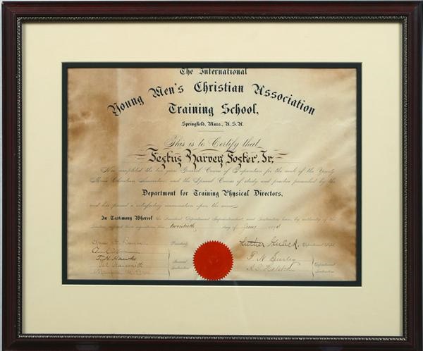 Monumentally rare and important 1894 graduate diploma from the International YMCA Training School in Springfield, Massachusetts and signed by Dr. James Naismith -- just 3 years after he invented basketball at that very school! One of the very few, if any, surviving documents from the YMCA School, not to mention one bearing the basketball Edison's signature -- and a fine one at that. The 12 x 15" document, approved by the Department for Training Phyiscal Directors" on June 20, 1894 is signed by Naismith as one of the school's "General Iinstructors" at the lower left in strong and clear black ink, "Jas. Naismith." Superb example of this profoundly important signature grades a solid 9/10. Document itself is in EX condition with moderate surface discoloration. Lending even greater value, if that's possible, is that this was a pivotal time in Naismith's life. Having come to America from his native Canada in 1890 to teach at the school, he was told to invent new gymnasium games. Naismith's indoor version of rugby, "duck on the rock" and soccer, with peach baskets as overhead goals -- the idea of the school janitor -- 10 feet above the floor (only because the lower rail of the balcony came down that far) quickly caught fire. By '95, he'd drawn up 13 rules of the game (12 of which are still extant) and the first college game was played, with woven wire having replaced the peach baskets and basketballs replacing leather soccer balls. But Naismith would leave Springfield that year to teach at the Denver YMCA School. In '98 he'd move on to Kansas University. This diploma, then, is one of the last (and only) Naismith pieces of memorabilia from his days at the Springfield YMCA School. Diploma is etched with the school's name across the top and with the graduate's name in the center. The school's red "Spirit/Mind/Body" motto is at the middle center between the signatures of the other insctructors and officers. Beautifully framed to 18 x 21 1/2". Comes with 2 LOAs.