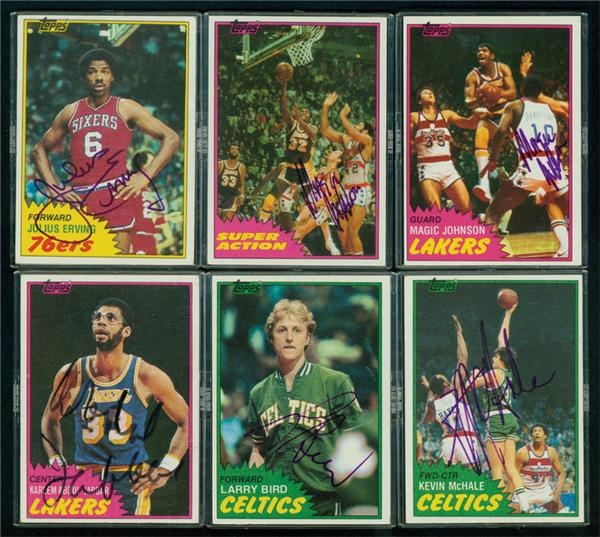 Card and autograph collectors alike will salivate with this offering of two sensational signed sets. From the 74-75 set comes #1 Jabbar, #39 Walton (RC), #129 Collins (RC), #196 Gervin (RC), #200 Erving (RC) and #250 Chamberlain. Missing only #10 Maravich. Highlighting the 81-82 complete set are #4 Bird, # 20 Jabbar, #21 M. Johnson, E75 McHale (RC), E104 Erving SA, E101 Larry Bird SA, and W109 M. Johnson SA. Each card has been signed in blue felt tip that grades an overall "8" out of possible "10".