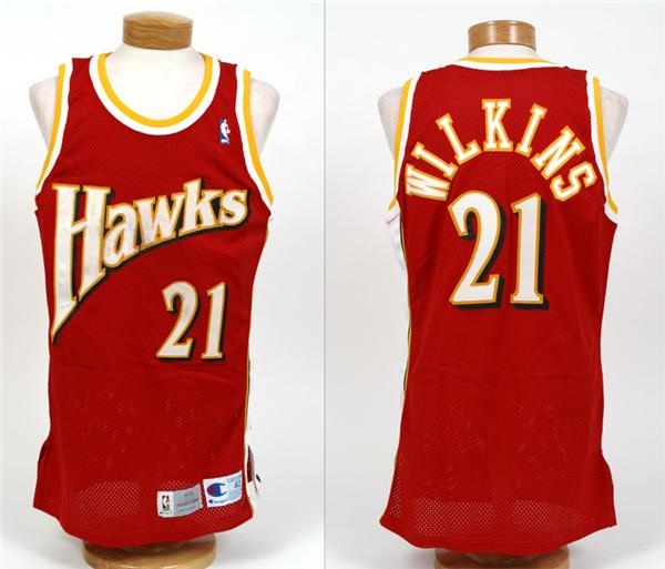 Dominique Wilkins performed his acrobatics in this Atlanta Hawks jersey just before he was traded to the Clippers in the 1993-94 season. It is one in a long line of splashy designs in the Hawks' franchise. Note the thick white piping down just one side of the fire-engine red mesh singlet. The smudges, stains and slashes on the white "Hawks" emblazoned across the chest tell of dives on the hardwood and drives through sweat-soaked defenders. Nice use.