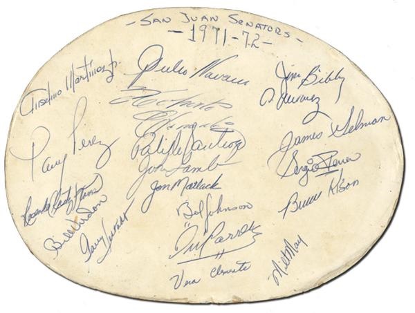 This 1971-72 San Juan Senators' plaque signed by Roberto Clemente is from the Puerto Rican League, but the roster is Major League All-Star by any standards. Besides Clemente's signature those of Tony Perez, Jon Matlack, Jim Bibby and Bruce Kison also flourish in blue ballpoint inkupon the 7- by 10-inch egg-shaped cork wood. And just why did Vera Clemente, the Hall of Famer's wife, sign her name? Maybe she had a better season. Roberto Clemente played for San Juan months after leading Pittsburgh to victory in the World Series and just months before he was killed in a plane crash.The plaque is in EX condition and the signatures are 9-10/10.