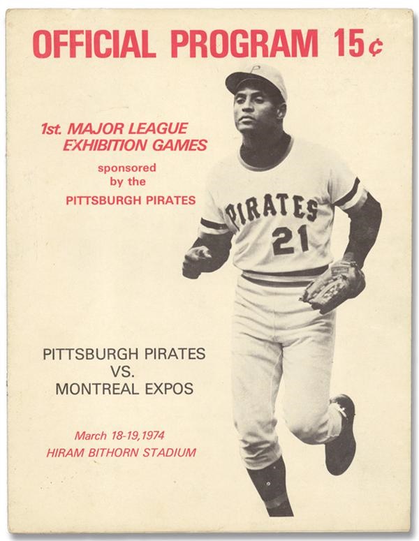 The Pirates paid homage to their fallen warrior a year after his death by playing two exhibition games against the Expos on March 18-19, 1974 in San Juan's Hiram Bithorn Stadium, where Clemente starred decades before in the Puerto Rican league. This rare program "dedicated to Roberto Walker Clemente", as it says on page 3, has a moving photo of him on the cover in his Buc uniform against a plain white backdrop broken only red and black cover lines. Inside are 2 photos of him, an image of his HOF plaque, and the word "Clemente!" above a text block with a facial image. Unscored, unmarked program is EX+.