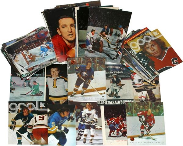 Unreal collection of early 1960-80s color magazine photos beautifully signed by many NHL stars of the era. Howe, Hull, Crozier, Messier, Mikita, Beliveau, Maniago, Schultz, Milt Schmidt, Ted Lindsay, Elmer Lach, Derek Sanderson, Esposito, Glen Hall, Tretiak, Mahavolich, French Connection, Boom Boom Geoffrion and on and on and on. The greats, the enforcers, the goalies, the coach's and the role players who made this hockey's greatest times. This massive hoard of vintage prints cannot be duplicated at any cost. There are glossy color pages with three or more fantastic signings. There are multiple autographs of some stars on various shots. At least 250+ different autographs. Simply awesome hockey history in vivid color!! All NRMT+