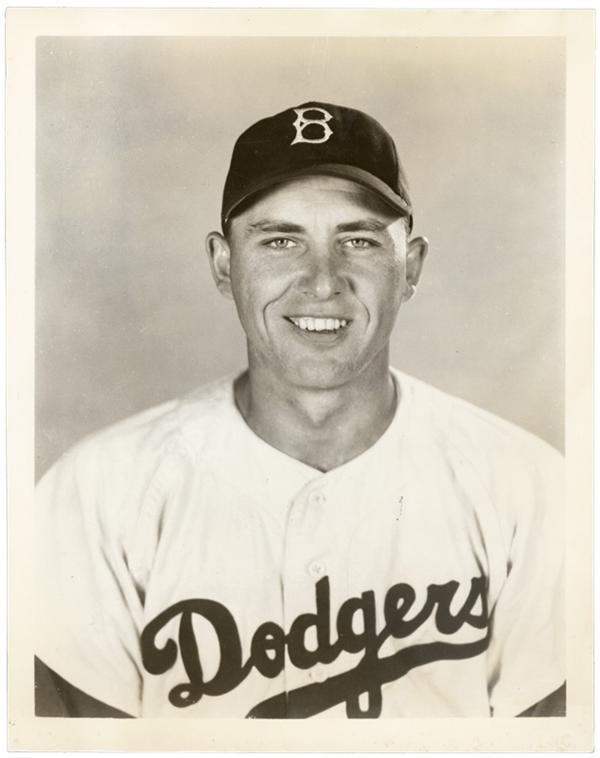 Duke Snider saying cheese and Walt Alston looking dignified are two of the most diverting images in this collection of Brooklyn Dodger press photos from the 1940s and '50s, which had something for everyone who holds a soft spot for the Bums. Forty-six 8 x 10s in all from a few different years and some dupes. Includes Roy Campanella, Gil Hodges, Roger Craig, Carl Erskine, Chuck Dressen, Pee Wee Reese, Don Newcombe (2), Carl Erskine, Carl Furillo, Joe Black (4 dupes), Ralph Branca (2), Billy Cox, Dan Bankhead (the first black pitcher in the major leagues), Randy Jackson, Sandy Amoros, Jake Pitler and the coaches, and many more. The majority of the NRMT prints look as if they never left Brooklyn.