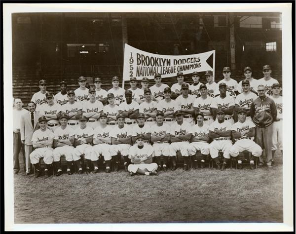 Vintage cache of 26 Brooklyn Dodger team photos from 1952 lets you share in the winning feeling many times over. Smiles and arms proudly folded tell of a job well done: 96 victories, league-leading attendance at Ebbets Field, and, stretched behind them, the pennant. Note Duke Snider under the "C" in Champions, Jackie Robinson near the middle of the second row and Roy Campanella second from the right in the front. These 8-by-10 beauties are all near-flawless originals (NRMT). The photos, like the passing seasons, have done nothing to taint the Boys of Summer.