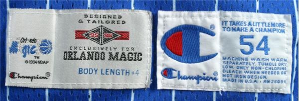 Alternate road jersey that covered the broadest back in the NBA during his final season in Orlando -- when he was named as one of the league's top 50 all-time players, even before winning any of his 3 titles with the Lakers. Front of jersey is festooned with "Orlando" and back with "O'Neal", with "32" on front and back, all in white on black tackle twill. NBA patch on upper left front. Left front tail tagging is "Champion" with the year "1995-96" and "Body Length +4", beside a "Champion" label with the size "54". Evident game use, no alterations. LOA.