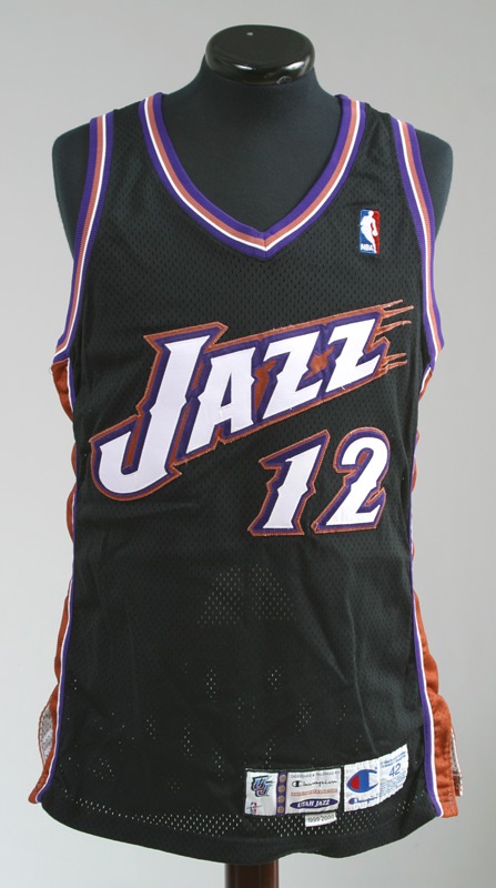 Stockton's Jazz jerseys had little time to drip-dry -- in 19 seasons with the Jazz, the prototypical point guard failed to play all 82 games only three times. He wore this black road mesh jersey during one of those full-length seasons, 1999-2000, when the NBA's all-time assist leader dished off for 8.7 a game and averaged 11.5 points. "Jazz" is across the front and "12" on front and back in white on purple/brown tackle twill, while "Stockton" is on back in white. NBA patch on upper left front. Left front tagging are two "Champion" exclusive labels, one with the size "42" and "1999-2000" flag tag. Evident game use, no alterations. LOA.
