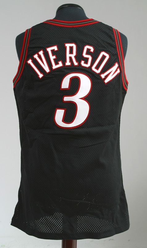 Spectacular jersey worn by "The Answer" during the 1997-98 season while he was hitting for 22 points a game in only his 2nd season with the Sixers. "Sixers" spans the front of the the black road mesh jersey in multicolored embroidered letters. Back has "Iverson" while "3" is on front and back all in white on red tackle twill. NBA patch on upper left front. Left front tail has "Champion" exclusive label with "1997-98" and "Body Length +2" next to "Champion" label with size "42". On inside lower left is "2 Inch Extra Length" label. Evident game use, no alterations. LOA.