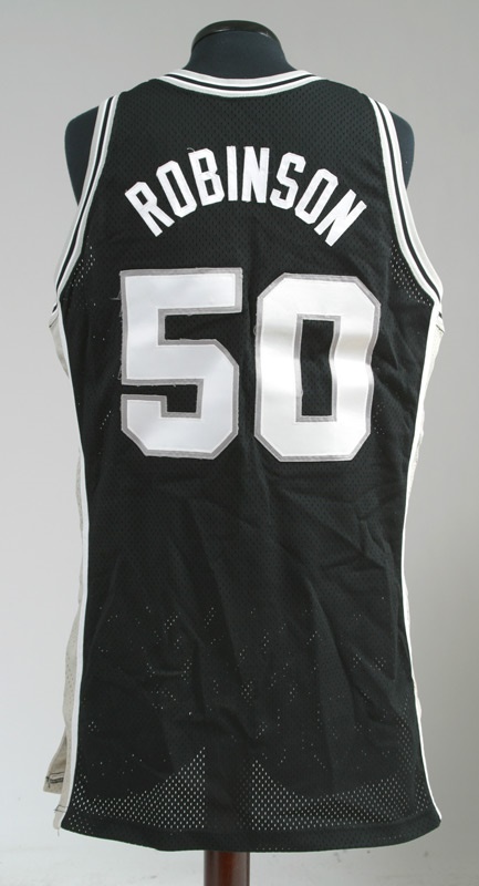 Coming off an MVP year, the Admiral notched his 5th straight monster season (25 ppg, 11.2 rpg) in 1995-96. The future Hall of Famer's black mesh road jersey has "Spurs" in white tackle twill across chest in white on silver/black tackle twill, "Robinson" across back in white tackle twill, "50" on front and back in white on silver tackle twill. Robinson has signed his name on the front "5" with "Matt. 6:33" in black marker, grading 9/10. NBA patch on upper left front. Left tail tagging is the "Champion" exclusive label with the year "1995-96" and "Body Length +4", alongside "Champion" label with size "46". Jersey shows game use and has no alterations. LOA.