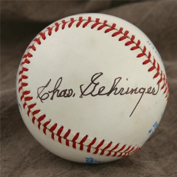 You'll rarely find a HOFer-signed ball in as immaculate a condition as this snow white bauble signed by two popular Tiger HOFers, Hammerin' Hank Greenberg and Charlie Gehringer, each of whom signed the ball at Tiger Stadium on the day their numbers were retired. Greenberg, one of the most prolific sluggers ever, left a smooth and jaunty marker on the sweet spot in dark blue felt tip, while "The Mechanical Man" laid down a precise and elegant autograph on a side panel in black ballpoint. Gehringer must be classified as a perfect 10, Greenberg a 9 only because of a slight smudge on the "k" in Hank. OAL (MacPhial) ball is NRMT with nearly invisible wear to the left of the MacPhail stamp.