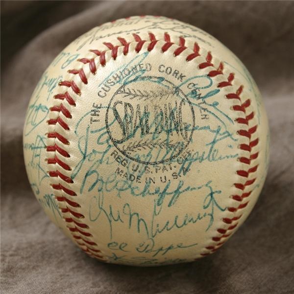 Great '54 Cubs team signed ball with rare rookie-year signature of Ernie Banks in addition to fellow HOFer Ralph Kiner, in his next-to-last season in the majors. Banks, signed from the Negro Leagues' Kansas City Monarchs the year before, hit .275 with 19 homers and 79 RBIs, a prelude to the 19-year career that yielded 512 dingers. ONL (Giles) ball has 31 signatures in all, including manager "Smilin' Stan" Hack, Hank Sauer, Gene Baker, Bob Talbot, Dee Fondy, Walker Cooper, Steve Bilko, Hal Jeffcoat, etc. Banks and Kiner typical of the overall 7-to-8 grade of the signatures in blue ink. ONL (Gilkes) ball is EX-MT, toned to a delightful light gold hue.