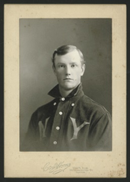 There were no "Yankees" yet; Delahanty wears the uniform of the New York Highlanders in this incredible cabinet from the studio of famed photog Horner. Image is razor sharp, and just barely touched by foxing which is contained mostly in the lower right corner. New York baseball historians should not let this opportunity pass.
