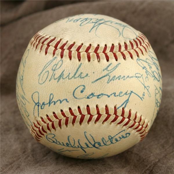 Team signed ball from the Braves' second year in Milwaukee, made royally important by the rookie-year grade-8 signature of Hank Aaron, who stepped right in at age 20 after destroying the Sally League the year before and hit .280 with 13 homers and 69 RBIs. The core of the '57 champion Braves was in place, as the ball includes fellow HOFers Spahn and Mathews, as well as Burdette, Pafko, Adcock, Logan, Bruton, Crandall, Conley, Johnson, Cooney, White, Walters and manager Charlie Grimm. Signatures range 7 to 9 out of 10. ONL (Giles) ball EX-MT with light toning and very mild soiling in spots.