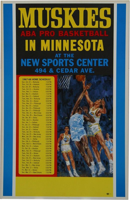 Extremely rare poster schedule for the Minnesota Muskies' first and only season in the American Basketball Association. The cardboard poster is 18 x 30 inches, in excellent shape, and boasts strong colors in the type and in the silk screening. Near impossible to find piece of ABA history.