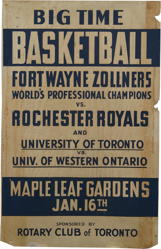 The Fort Wayne Zollners were the team to beat in the late 1940s, so any game involving them was worthy of such a large-type public notice. The lettering is vivid enough on the 18- by 30-inch cardboard to inspire visions of set shots floating through the dim gym lights. The Zollners won the National Basketball League championship two straight years before they joined the Basketball Association of America, the precursor to the NBA. There's staining plus a few tears and punctures that add reality to this vintage piece of NBA history.