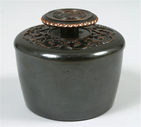 Handsome cigar humidor presented to the players at the 1953 NBA All-Star Game, very much politically correct (and likely much used) in the smokin'-in-the-boy's-room '50s. The top of the heavy tin humidor is the grabber, literally, with a round handle beautifully engraved "National Basketball Assn. Annual All Star Game-January 13, 1953-Fort Wayne, Ind." Around the handle is a "gold tooth" pattern and underneath it is a laurel leaf design. Underside of top is a cork reading "Dip in cold water." Humidor is a beautiful chocolate brown color with the engravings tinged bronze-gold. Amazingly NRMT with some near invisible scratches along the surface, a few black streaks on the red interior and scattered tobacco residue on the underside of the top. 5 1/2" in diameter, 5" from base to handle.