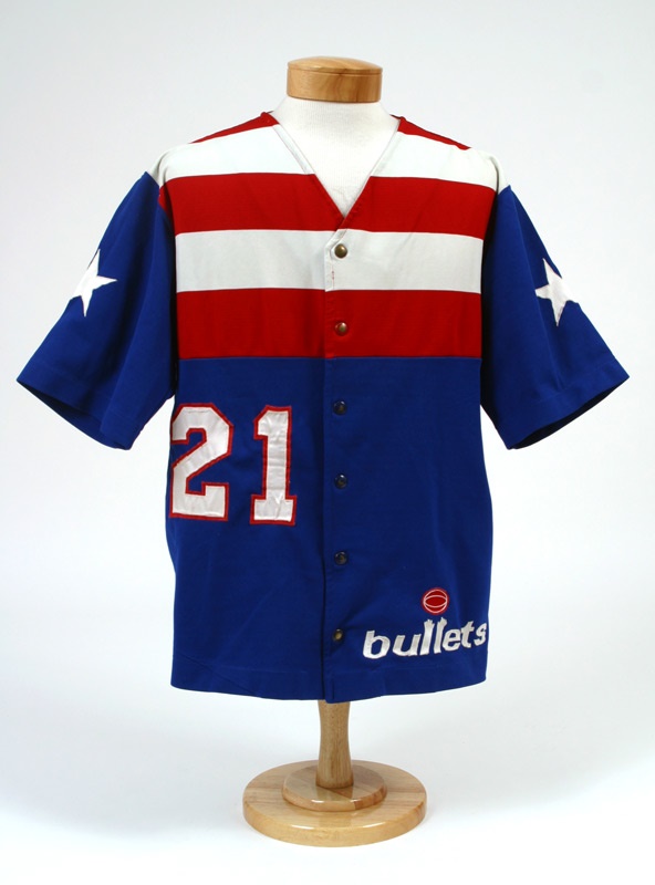 The hands extending from the l's in "bullets" to reach the basketball provide the kitsch of Dave Bing's game-used Washington warmup jacket from the 1976 and '77 seasons. The player himself gives the garment its class. Despite a detached retina, Bing, a seven-time All-Star with the Pistons, continued the twilight of his career with Washington and excelled for two winning teams. Red- and white-striped upper chest and back; blue sleeves with white stars; and a white No. 21 (dryer-crumpled and frayed) on the front with red border leave no doubt that Bing's team toiled in the nation's capital.