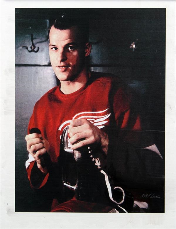 Sports artist Bill Purdom captures Gordie Howe in his early glory as a Detroit Red Wing in a 14x 21" print on canvas. You can feel the chill of the locker room as Howe holds a skate on his knee. The artist signed at bottom-right and an onion-skin flap preserves its condition. This is a great piece from arguably the best Sports artist of our era.