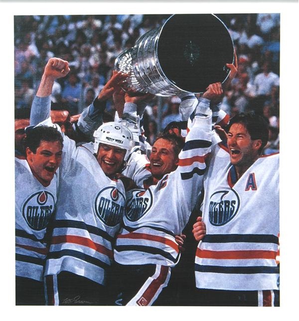 Bill Purdom painted the Edmonton Oilers hoisting the Stanley Cup, and this print on canvas shows Craig MacTavish, Mark Messier, Wayne Gretzky and Kevin Lowe reveling in this one delicious moment. Purdom print on canvas, 18 x 24 inches, is mounted on rigid foam and has an original signature. Note how Purdom even pays careful attention to the fans in the background and in how the Cup shimmers in the outstretched arms of The Great One.