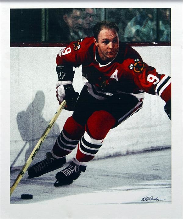 Just like the fans behind the boards in this print by by sports artist Bill Purdom, catch a classic glimpse of Bobby Hull in his prime. Vivid work melds photo-realism and detail (note the Northland on Hull's stick) with short strokes and shadow to create an edgier vibe. With an original signature by the artist, the image measures 20x24" and will play bigger when the cardboard-backed canvas is mounted properly. Hull is a Hall of Famer who deserves Hall of Fame display. Purdom, whose creations regularly pull in thousands, deserves no less either.