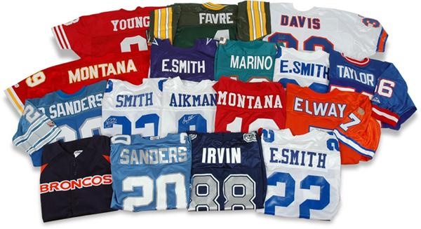 Spectacular lot of 17 NFL replica jerseys from Wilson, Majestic, Pro-Line, Champion and Apex. Twelve of the 17 are signed. Check out these for magical names all SIGNED: Dan Marino (teal), Joe Montana (two signed, one red 49ers and one red Chiefs), John Elway (orange), Steve Young (red '49ers), Troy Aikman (white Cowboys), Brett Favre (green Packers), Emmitt Smith (there are three signed all Cowboys, three white and one blue), Lawrence Taylor (New York Giants blue, faded sig), and Terrell Davis (white Broncos). Unsigned jerseys include two Barry Sanders (blue), Michael Irvin (blue), Emmitt Smith white Wilson with 75 Anniversary patch, and blue Broncos warm-up shirt with a "Super Bowl XXXIII Champions" patch on sleeve. Signatures overall EX-MT on these Canton-ready jerseys.