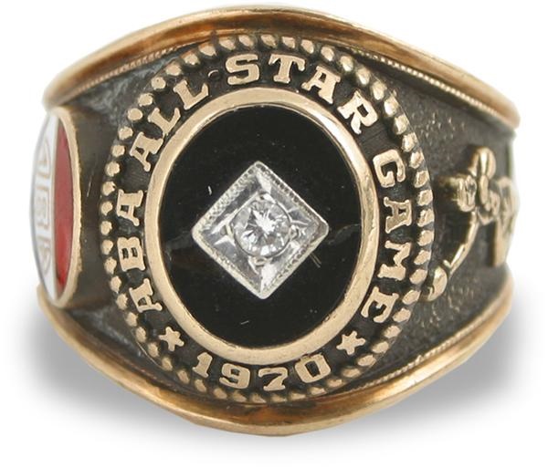 A super piece of ABA memorabilia, this 1970 All-Star Game ring belonged to less than Mike Storen, the peripatetic executive who from '69 to '74 bounced between jobs as GM for the Indiana Pacers and Kentucky Colonels, co-owner of the Memphis Sounds, and league commissioner. Storen got the 10k gold beauty at the '70 All-Star Game in Indianapolis when he was still the Pacers' GM (they'd win the title that season). Game MVP Spencer Haywood did a little better, getting a huge trophy, a Dodger Challenger and a color TV. For Storen, though, the ring was priceless, and for ABA collectors it may be. Ring has a diamond core set on a black stone, with "1970 ABA All-Star Game" engraved on the corona. One shank has an enamel red, white and blue ABA ball and "Indianapolis Indiana," the other a figure on a player. Interior of band engraved "M. Storen." Slight crack in the black top stone and on the red enamel of the ball, o/w NRMT. LOA from Storen. Haywood's Dodge is long gone; this ring is forever.