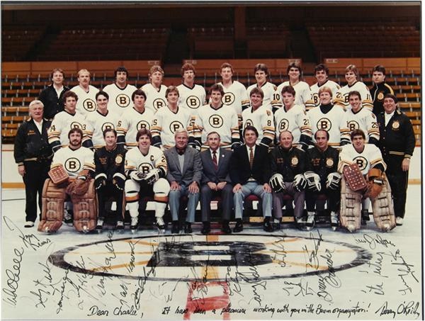 Staggering 10 1/2 x 14" team shot of the 1983-84 "Broons" signed by 20 of the boys who finished atop the NHLA Division with a 49-25-6 record. Signatures include Ray Bourque, Guy Lapointe, Terry O'Reilly, Bruce Crowder, Gord Fluzak, Pete Peeters, Randy Hillier, Mike O'Connell, Tom Fergus, etc. O'Reilly added the inscription, "It has been a pleasure working with you in the Bruin organization!" along the bottom. Signatures in black marker average VG-EX, some NRMT, some faded. Photo itself is NRMT mounted on a black backdrop. LOA.
