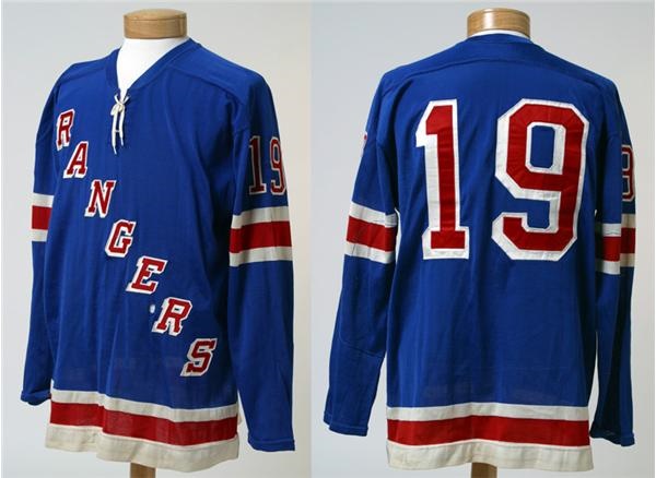 Many Big Apple hockey mavens' spines will tingle at the sight of this classic "Broadway Blueshirt" worn by "Gentleman" Jean Ratelle in 1970, for several reasons. First, the blue dureen road jersey with "Rangers" running diagonally across the front and a huge "19" across the back and on both sleeves in red and white tackle twill is a perfect exemplar of the "old-style" Ranger motif (complete with the lace tie front) that the team employed from its origination in the 1920s until 1977 when the diagonal letters were replaced by the "shield" logo that fans despised. The next year new coach Fred Shero brought back the traditional style, but it seemed like an updated version rather than an original, as it does to this day (when hockey is actually played, that is). Second, the debonair HOF center was such a longtime favorite at Madison Square Garden as the center of the "GAG Line" with Vic Hadfield and Rod Gilbert. And third because Ratelle is synonymous with the blockbuster multi-player trade with the arch-enemy Bruins early in the '75-76 season that in effect swapped Ratelle for Phil Esposito. The shirt has tagging on inside hem - Size 48 Cosby, the year tag - 1970. It has authentic battle scars, with stick marks and areas of discoloration on the sleeves and red and white waistband and several holes including a half-inch cleave between the "E" and "R" on the chest. A fabulous shirt off the back of one of hockey's class acts.