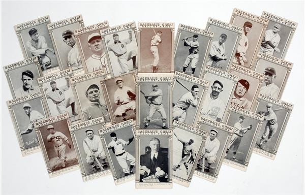 Talk about an explosion of riches! Hundreds of original Baseball Hall of Fame exhibit cards honoring some of the game's all-timers. The classic cards, measuring 3 1/4 x 5 1/4", have "Baseball's Great, Hall of Fame" across the top, with a b&w image of each player within Roman-style columns, a facsimile signature, and a brief bio on the bottom. Backs are blank. Cards include Ty Cobb, Connie Mack, Honus Wagner, Walter Johnson, John McGraw, Grover Cleveland Alexander, Rube Waddell, George Sisler, Eddie Collins, Frank Chance, Johnny Evers, Joe Tinker, Mickey Cochrane, Roger Bresnahan, Clark Griffith, Hughie Jennings, Fred Clarke, etc. Many duplicates of most of these, a real bonus considering that even a single one of these babies is highly collectible, especially the Cobb. Cards are overall EX-MT with many NRMT.