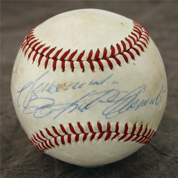 Roberto Clemente was a Hall of Fame-bound supernova on the diamond and a peerless humanitarian off it. His name carries an impact wherever it goes, that it landed on this baseball in the form of his furiously scripted autograph is pure luck for anyone who nabs this treasure. Clemente wrote "Sinceremente, Roberto Clemente" and you better believe he meant it. He signed this EX Rawlings "Official League" sphere for a child in a San Juan Hospital - talk about strong medicine. As the years pass since a Dec. 31, 1972 airplane crash took his life at age 38, Clemente has morphed into mythical stature. Just mention his name and watch reverence light a fan's eyes; show them this bold (8-9/10) autograph, and there's no telling how they'll react.