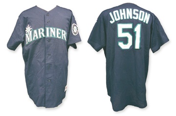 Unless you're six-foot ten, this jersey probably won't fit you too well, but you shouldn't be wearing it anyhow. He's a future HOF'er--treat his jersey with respect. "Mariners" sweeps chest of this road blue mesh gamer, with "Johnson 51" on back. Logo patch on left sleeve. Light but evident wear. "Majestic [size] 50" tail tagging.