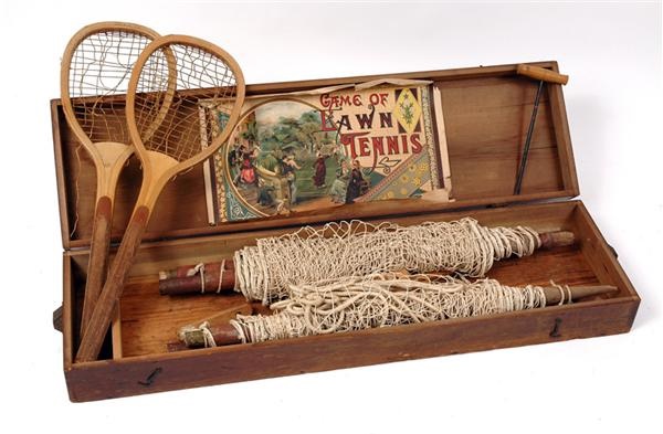 Remember the days of glamorous people frolicking on estates, rackets in hand, daintily chasing a stray shot. That was Lawn Tennis at the turn of the century and this is the stunningly preserved accouterment of that lifestyle. A complete Lawn Tennis set (EX) with rackets, net and four posts is entirely intact in its handsome original 39- by 12-inch wood box. Just smelling the wood rackets makes you want to put on your Victorian best and play. Wimbledon and the improvement of a vulcanized rubber ball was making tennis more competitive for both men and women, but any Lawn Tennis set taken home was probably for a weekend romp. In case your imagination isn't firing, the kit comes with original lithograph label inside box (VG) showing ladies and gentleman on country grounds playing doubles. Advantage, bidder.