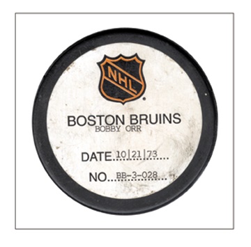 Bobby Orr set the bar for offensive defenceman in the NHL. His 260 goals, including forty-six in a single season have not been matched by many.  During the early 1970's the NHL instituted a program whereby the pucks used to score each and every goal in NHL play were collected, labeled and marketed to the public.  This Converse Boston Bruins game puck is labeled "Boston Bruins, Bobby Orr, 10/21/73."  Imagineā¦this puck actually traveled from the blade of Bobby's stick and found its way into the twine at the back of the net in Boston Garden.  The accompanying NHL Certificate lists additional information including the assist credits.  From the personal collection of long-time Bruins trainer John "Frosty" Forristall.