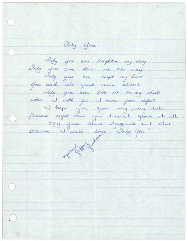 So you think championships, game-winning jump shots, and gazillions of dollars from commercials are the only things that make Michael get sentimental? Not so, according to this incredible love poem (circa 1981) in which His Airness turned himself into Ralph Waldo Jordan, pouring out his heart apparently to a girl, though some inscrutable lines of the poem make one wonder just who or what he was in love with. Titled "Only You", it reads: "Only you can brighten my day, Only you can show me the way. Only you can exept [sic] my love, You and the great man above. Only you can kiss my cheeks, When I with you I never fear defeat. I hope you grow very, very tall, Because right now you haven't grown at all. My face shows happiness and blue, Because I will love only you." He signed a diagonal "Michael Jeffrey Jordan" -- the only time we've ever seen a Jordan signature using his full name, and rating 9/10, to boot. While we wonder why a girl (or whoever) growing tall would be so important to him, the "I never fear defeat"part is pure Michael Jordan. Poem is on an 8 x 10 sheet of lined looseleaf paper that is NRMT with 1 horizontal and 3 vertical fold marks that are barely visible, o/w pristine. Michael, you old softie.