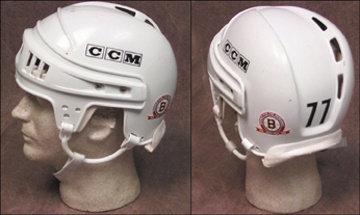 White CCM helmet worn by soon-to-be Hall-of-Famer Raymond Bourque. Number "77" decal decorates the back of this well-worn lid. .Manufactured in 1993-94, was worn during the Bruins' 1994-95 season, their last in the Garden. A "Thanks For The Memories - Boston Garden 1926 - 1995" sticker appears on the lower left side of the helmet. All padding is intact but the straps have been replaced and a shield, obtained from the Bruins, has been included. From the collection of former Bruins trainer John "Frosty" Forristall.