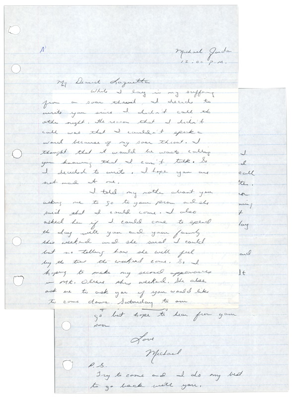 Michael wasn't yet Air Jordan, but even as a senior at Laney High School in Wilmington, North Carolina, only two years after being cut from the team, he was good enough not only to win a scholarship to North Carolina but to be able to get a lot of tail -- even if his mother had to approve any girl he went out with. This is made clear by this remarkable handwritten letter Michael dated April 21, 1981, during his last few weeks at Laney, to a girl from another school in Mt. Olive who had asked him to be her prom date. Beginning "My Dearest Laquette," he perhaps stretches the truth a wee bit explaining why he hadn't called her: "While I lay in my suffering from a sore throat, I decide [sic] to write you since I didn't call the other night....I thought that it would be waste calling you knowing that I can't talk." He goes on: "I told my mother about you asking me to go to your prom and she said I could come. I also asked her if I could come to spend the day with you and your family this weekend and she said I could but no telling how she will feel by the time the weekend come." Chivalrously, he invites her to come to a "basketball banquet at our house." But the kicker is the last paragraph in which he says he's can't wait to get to college "mainly to see you whenever I want to" and "to stay with you at least once without anything happening." Make what you will of that cryptically titillating statement. Letter in black ink covers 2 sheets of lined looseleaf paper and signed, "Love Michael." He also signed "Michael Jordan, 12:00 p.m." on the upper right corner of page one -- a NRMT early Jordan signature. Letter is NRMT with several light fold marks. Reading it may be the best lesson on how to be like Mike.