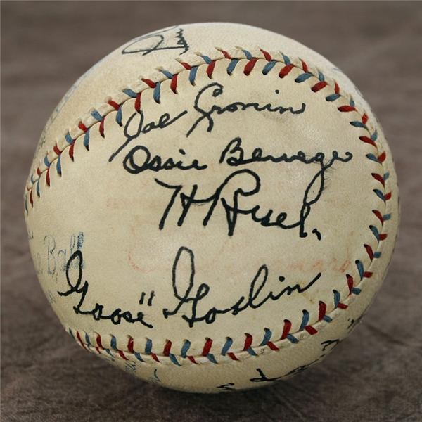 A rare Senators team with clout signed this ball -- in addition to the amazing Yankee duo of Babe Ruth and Lou Gehrig. Official American League (Harridge) baseball features classic red and blue stitching and boasts a total of twelve enhanced black ink signatures. The 1930 Senators featured the Cooperstown-bound Joe Cronin, Sam Rice, Goose Goslin and then-manager Walter Johnson, all of whom applied pen to ball. The vintage signatures hark back to one of the high points in the Senators' history, as the 1930 squad finished second in the American League with a 94-60 record, ahead of even the hated Yankees. At least they could get together on a baseball. Overall the autographs are EX-MT, with note to aforementioned signature enhancement.