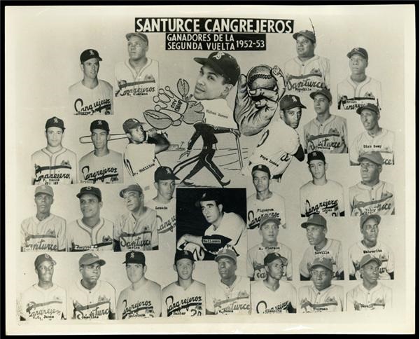Perhaps the earliest image of an 18-year-old Clemente in organized baseball is this photo montage of the 1952-53 Santurce Cangrejeros (Crabs), his 1st pro team. Clemente, who squeezed a rubber ball every day while in high school to build up his throwing arm, signed with the Crabs for $60 a month, a $5,000 bonus and a new glove. He proceeded to hit .356 that season, becoming a national sensation, and would sign a big league contract a year later. 8 x 10 montage shows Roberto along the bottom, with teammates that include Puerto Rican players, a few big leaguers and Negro league stars Bus Clarkson, Dick Seay and Bob Thurman. Illustration of team "crab" in center wearing a "City Champ" crown. Minor edge creasing o/w NRMT and the only one we have ever seen.