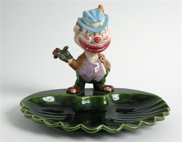 Willard Mullin's "Brooklyn Bum" character made the leap from newspaper cartoon to porcelain figurine, and never looked so good as on this marvelous hand-painted ashtray no doubt used more as a showpiece by Dodger fans than as a stogie graveyard. Figurine stands 6" high from tattered shoes to blue and white fedora, with great detail like a cigar in his left hand, whiskers and red nose on his face, purple vest and daisy in his lapel. Bum stands over a 7 1/2 x 9" green tray with rivulets for cigar placement. Piece is EX-NRMT with no nicks or sratches, with paint near 100%. We've never seen this one before.