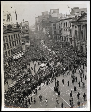 Did the residents of Brooklyn love their Dodgers? Well, take a look at the crowd that turned out to celebrate the securing of the N.L. pennant. Photo is so clear and detailed that deep in the distance you can make out a banner reading, "Beat the Yanks." But Mickey Owen and the boys dropped the ball on that one. EX.