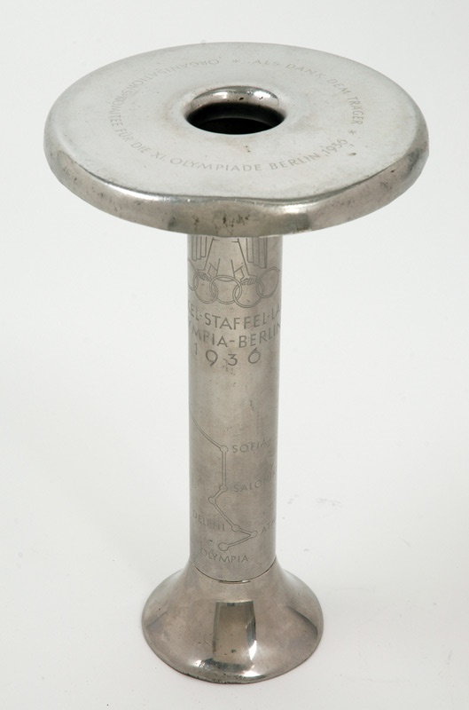 Few symbols of sports can reflect the values of good and evil as this extraordinarily rare and profound 1936 Olympic torch that bore a flame as a maniacal dictator who turned the Games into a propaganda exercise was about to turn Europe in to flames. . Reams have been written about the '36 Olympics and Adolf Hitler's show of "Aryan superiority" blunted by an African-American named Jesse Owens. But the torch says more than words with its steel gray bearing, both regal and coldly unyielding, chillingly engraved with "Fackel-Staffel-Lauf, Olympia-Berlin 1936" and European cities soon overrun by The Third Reich such as Belgrade, Budapest and Prague, and the German city of Dresden, which would be leveled by U.S. B-1 bombers. Torch was designed by Carl Diem and made by the Krupp Factory, which would soon be put to work making bombs. Inner ring is 5" in circumference, 10 3/4" high from base to disk-like top that includes the engraved "Komitee fur de Olypiade Berlin 1936." EX condition with no tarnish or soiling. A sad, but important, reminder that sports are sometimes more than merely games.