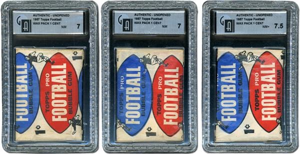 If a Johnny Unitas is hiding beneath the wax wrappers of these three Topps 1957 packs of football cards (NM+ GAI 7.5), toast your amazing fortune. If he isn't, this 154-card issue is still a champion, both for its dual-photo horizontal design, and for the maiden cards of Paul Hornung, Bart Starr and other luminaries of that era. We love the blue and red alternating footballs on the wrapper. Packs were still a penny then, a value that we will never see again in our lifetime.