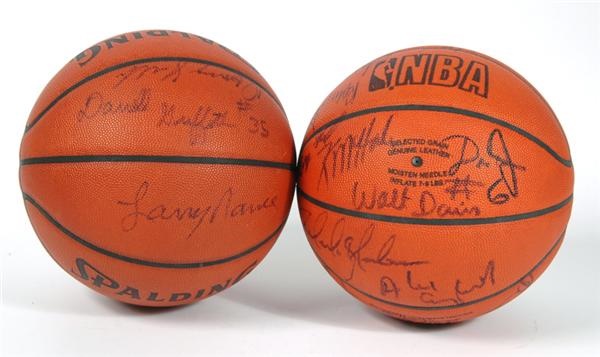 Impressive pair of signed spheres originates from a former NBA employee. Included is: 1) a Spalding Official NBA Game Ball signed by the contestants in the 1985 NBA Slam Dunk Contest. Michael Jordan, Julius Erving, Dominique Wilkins, Clyde Drexler, Darrell Griffith, Terence Stansbury, Orlando Woolridge, and Larry Nance are all present in bold black Sharpie marker. 2) a Spalding Official NBA Game Ball signed by participants in the 1987 NBA All-Star game. Twenty plus bold black Sharpie signatures include: Magic Johnson, Kareem Abdul Jabbar, James Worthy, Walt Davis, K.C. Jones, Tom Chambers, Moses Malone, and more. Near Mint-Mint (NM-MT).
