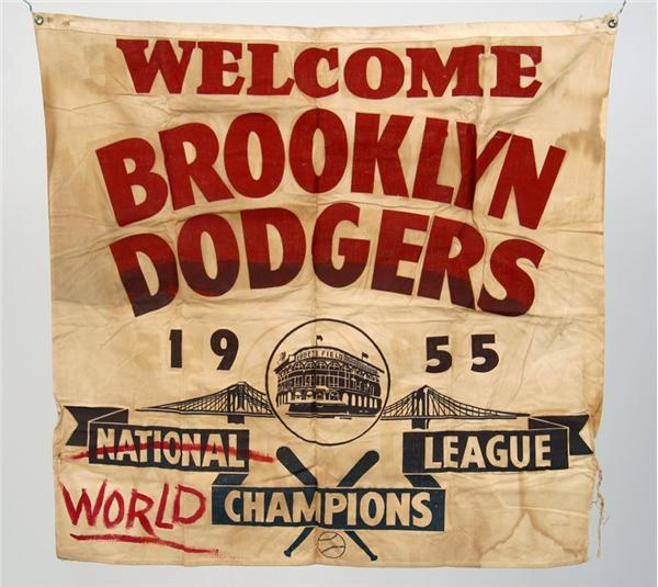 This great banner with a huzzah for the Dodgers probably hung high from a tree or lightpost somewhere along Flatbush or Bedford avenues or perhaps Eastern Parkway when the conquering heroes returned from the far-off Bronx with the 1955 World Championship under their belts and were given a victory parade by their fans. The ecstasy -- and perhaps the air of inevitability that they would again lose to the Yankees -- is reflected in the light tan muslin banner silkscreened in bright red with "Welcome Brooklyn Dodgers 1955 National League Champions" -- with "National" crossed out with a red slash and "World" inserted in red before "Champions." This alteration may have been the original concept of the banner, playing to the theme of long-delayed victory, or it may have been modified by an artistic fan once the championship was finally in the bag. Either way, the 33 x 35" banner is a delightful echo of the one and only time Brooklyn could raise such a banner. G-VG with understandable wrinkling and fold marks and mild soiling in spots and small section of shredding along the edge of the lower right side. Mounting holes on each upper corner. Great slice of "Bums" history at their finest hour.
